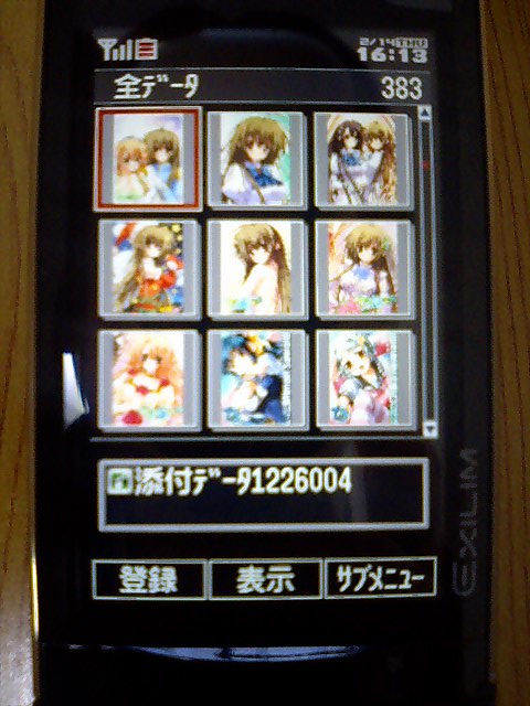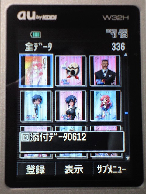 W32Hではサムネイルに重なる形でデータ名が表示されていたのですが、W53CAはワイド画面なのでサムネイルの下に表示されるように。